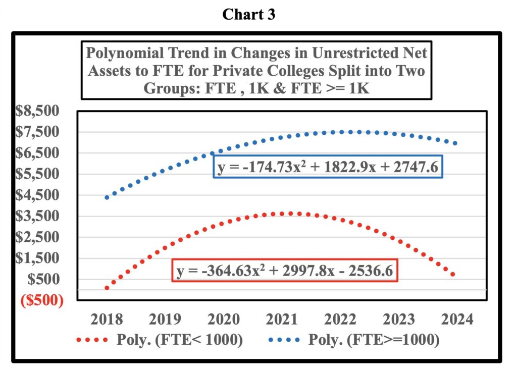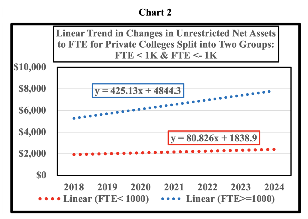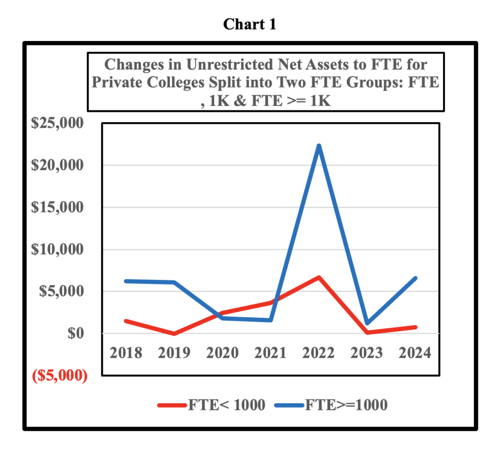 Chart 1 uses a simple ratio to estimate the impact of enrollment on unrestricted net assets: (Unrestricted Net Assets / FTE). The first chart illustrates that enrollment at small colleges is barely providing new funds for unrestricted net assets. In addition, the ratio for large colleges was erratic between 2018 and 2024. The data for both small and large colleges resulted in increases in the ratio in 2022 with large colleges showing a larger jump in the ratio. The bump in 2022 was probably due to the large sums pumped into colleges by the federal government to provide relief from the financial ravages caused by closing of most colleges for a year and transferring their students to on-line programs. The quick and unexpected move to online programs forced college to make large technology purchases.